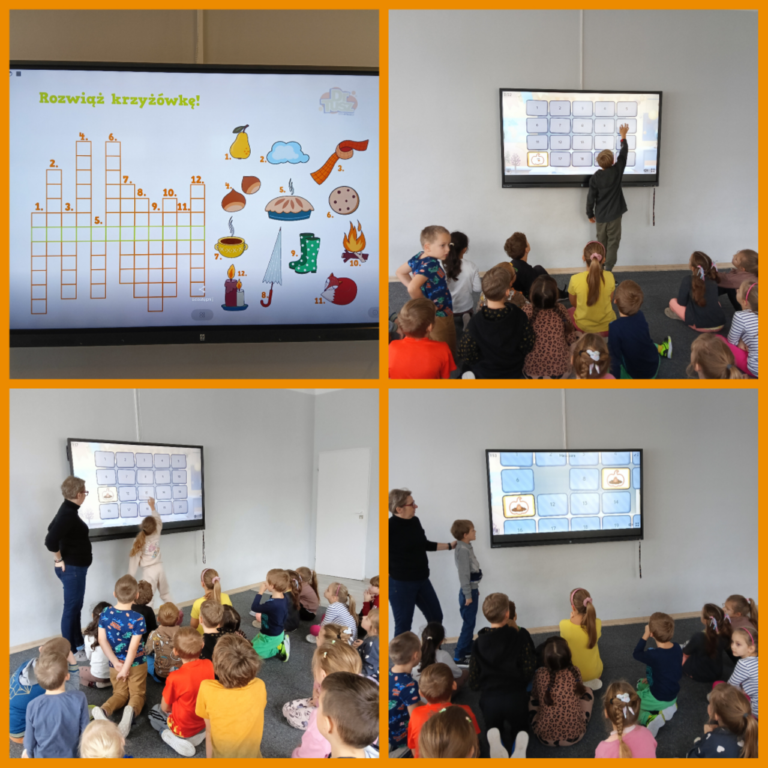 🧠 W czwartek dzieci kontynuowały temat – odbyła się burza mózgów „Co jadłam z dyni?”, kolorowanie jesiennych dyń, wykreślanka „Kolory jesieni” z wykorzystaniem tablicy multimedialnej, a na koniec wspólna zabawa z chustą animacyjną „Kurtyna w dół” 🎭🌈