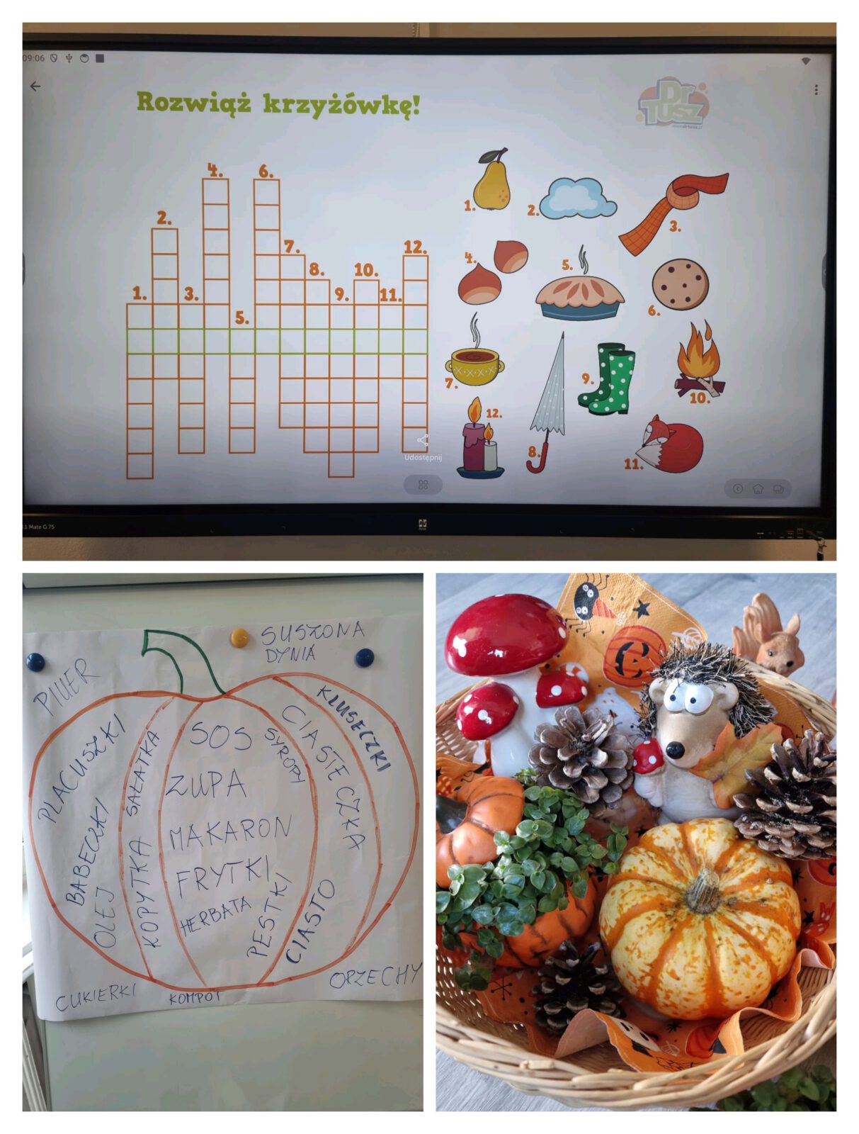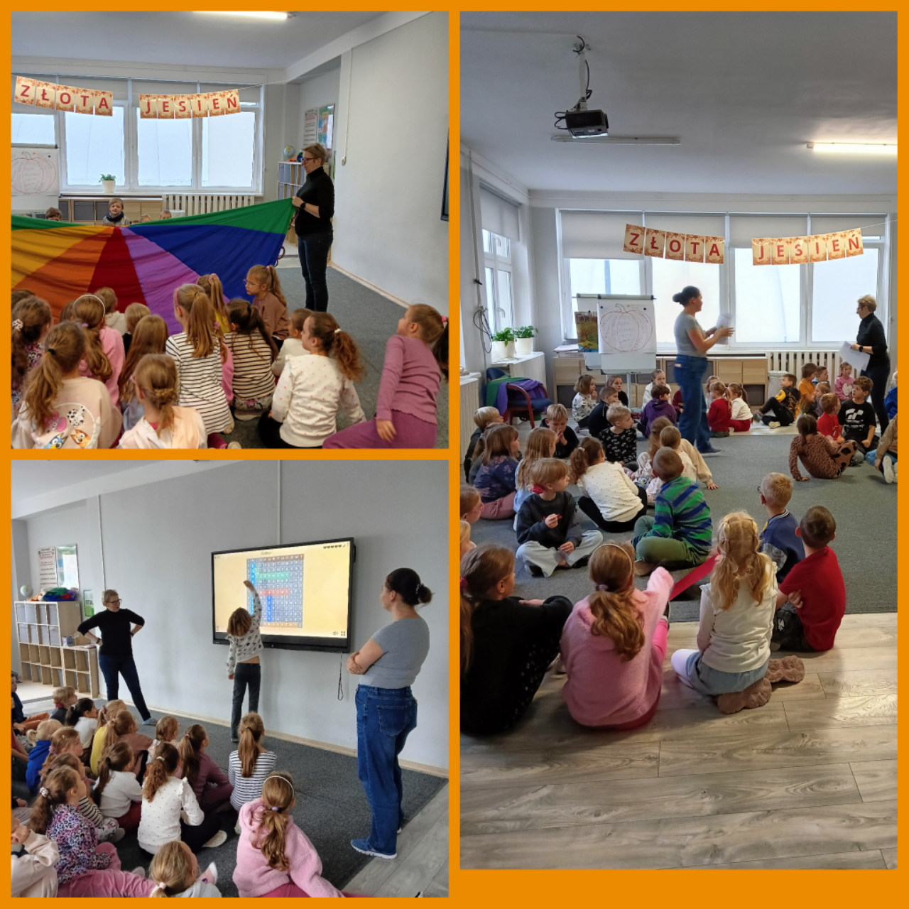 🧠 W czwartek dzieci kontynuowały temat – odbyła się burza mózgów „Co jadłam z dyni?”, kolorowanie jesiennych dyń, wykreślanka „Kolory jesieni” z wykorzystaniem tablicy multimedialnej, a na koniec wspólna zabawa z chustą animacyjną „Kurtyna w dół” 🎭🌈
