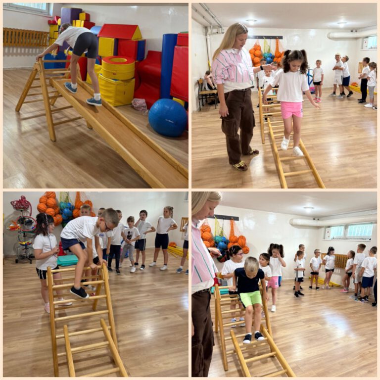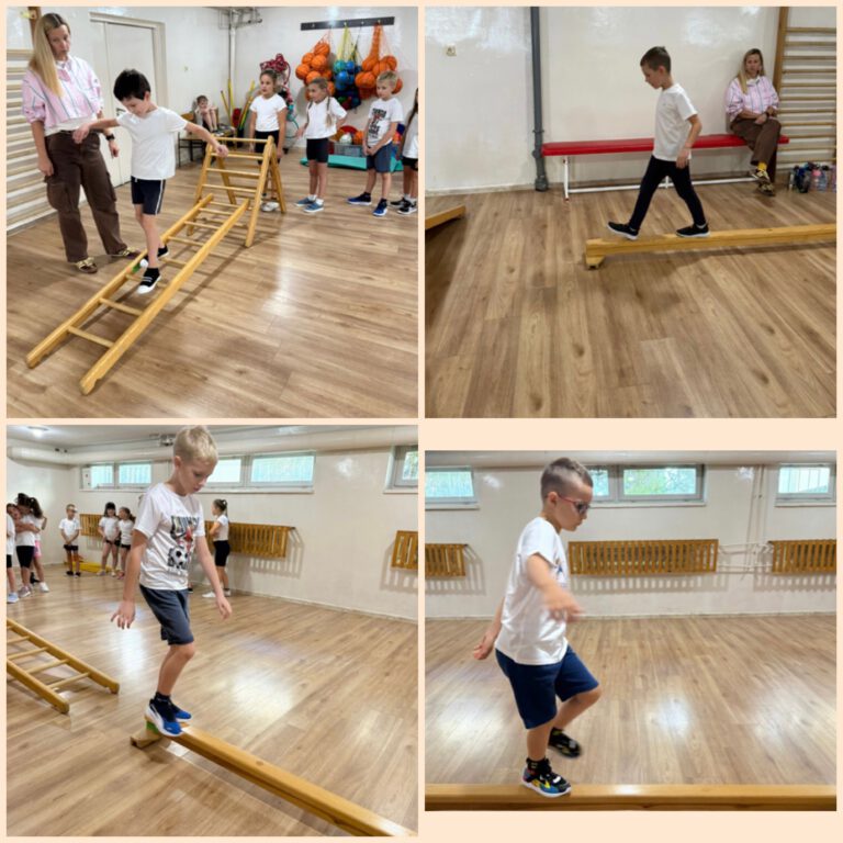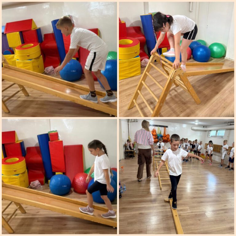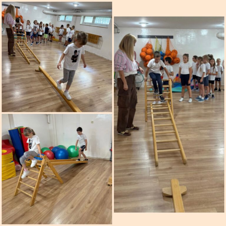 Uczniowie klasy 1c na lekcji w-f pokonują tor przeszkód z równoważnią.
