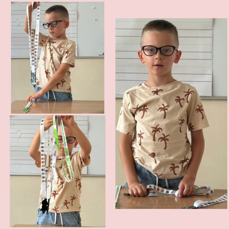 Uczeń klasy 1c Kuba Nogajczyk opowiada o swojej pasji, czyli rajdach rowerowych. Prezentuje medale oraz opowiada kolegom i koleżankom z klasy o radości, jaką dają mu wyprawy rowerowe z rodzicami.