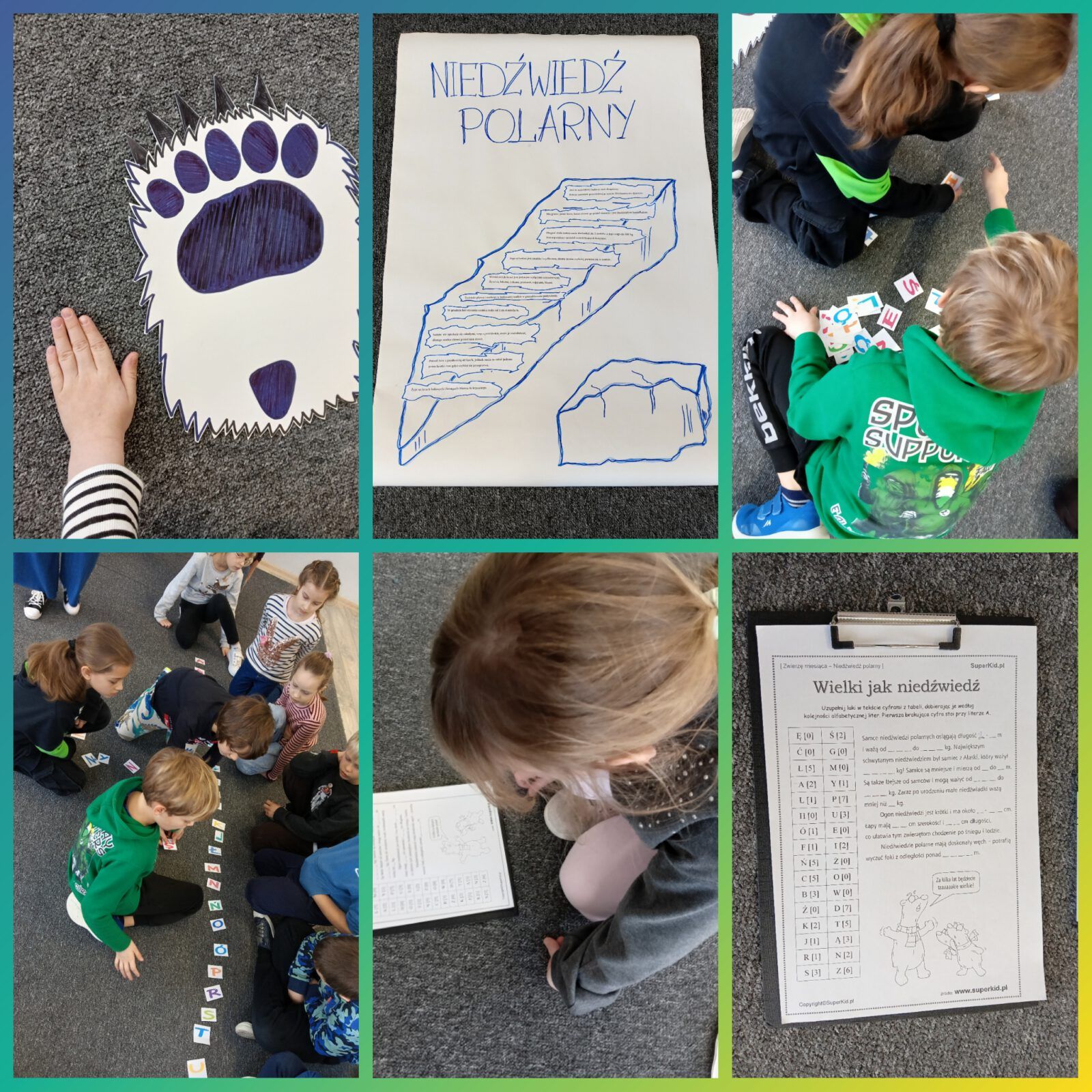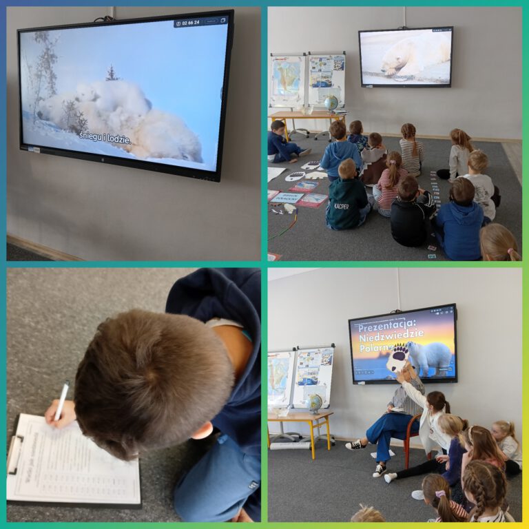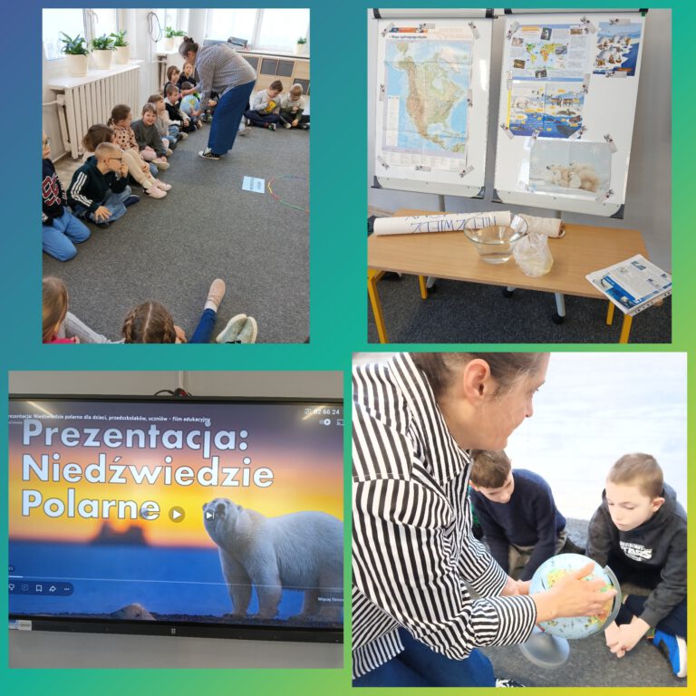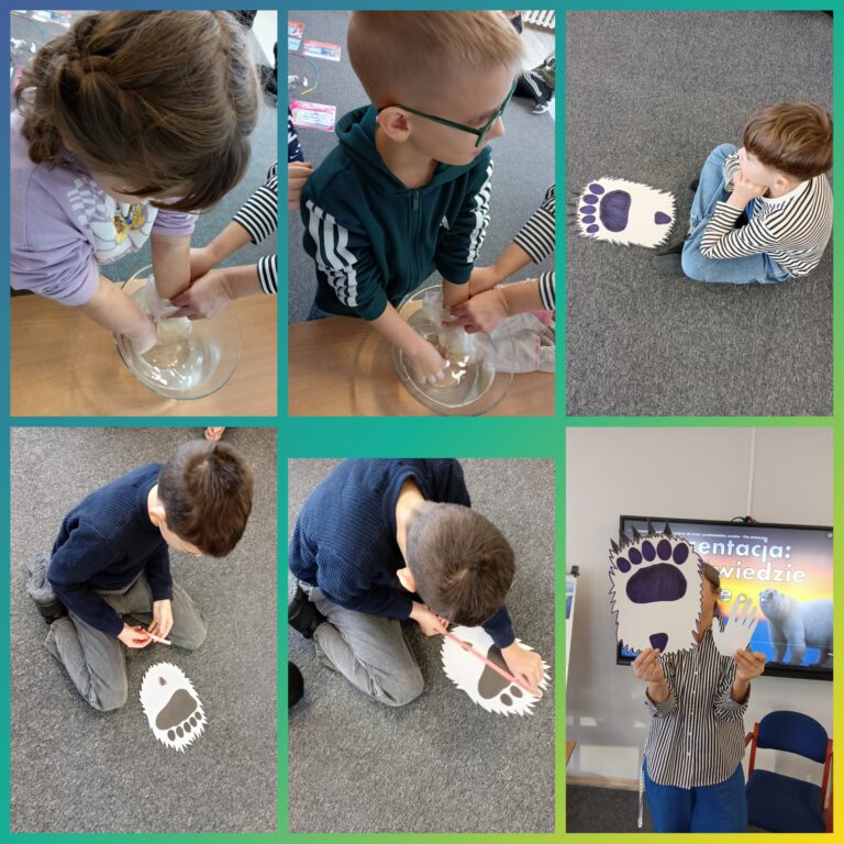 O tych i innych ciekawostkach dowiedziały się dzieci podczas zajęć w świetlicy szkolnej. Mierzyły długość i szerokość łapy niedźwiedzia polarnego, porównywały ją z wielkością własnych dłoni oraz dowiedziały się, dlaczego niedźwiedzie nie marzną uczestnicząc w doświadczeniu z „rękawicą tłuszczową”. Odszyfrowały również zakodowaną wiadomość wykazując się bardzo dobrą znajomością alfabetu. Obejrzały prezentację medialną oraz bezbłędnie odpowiadały na pytania quizu będącego podsumowaniem zajęć.