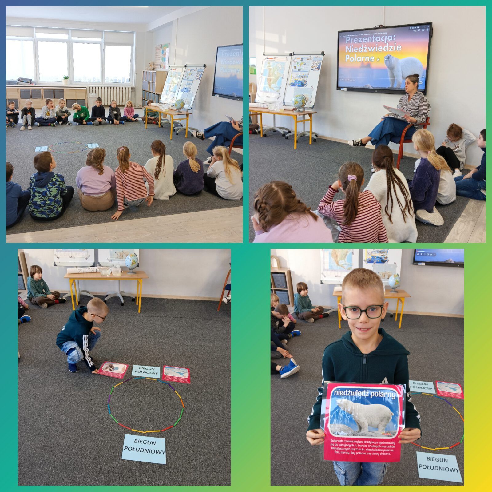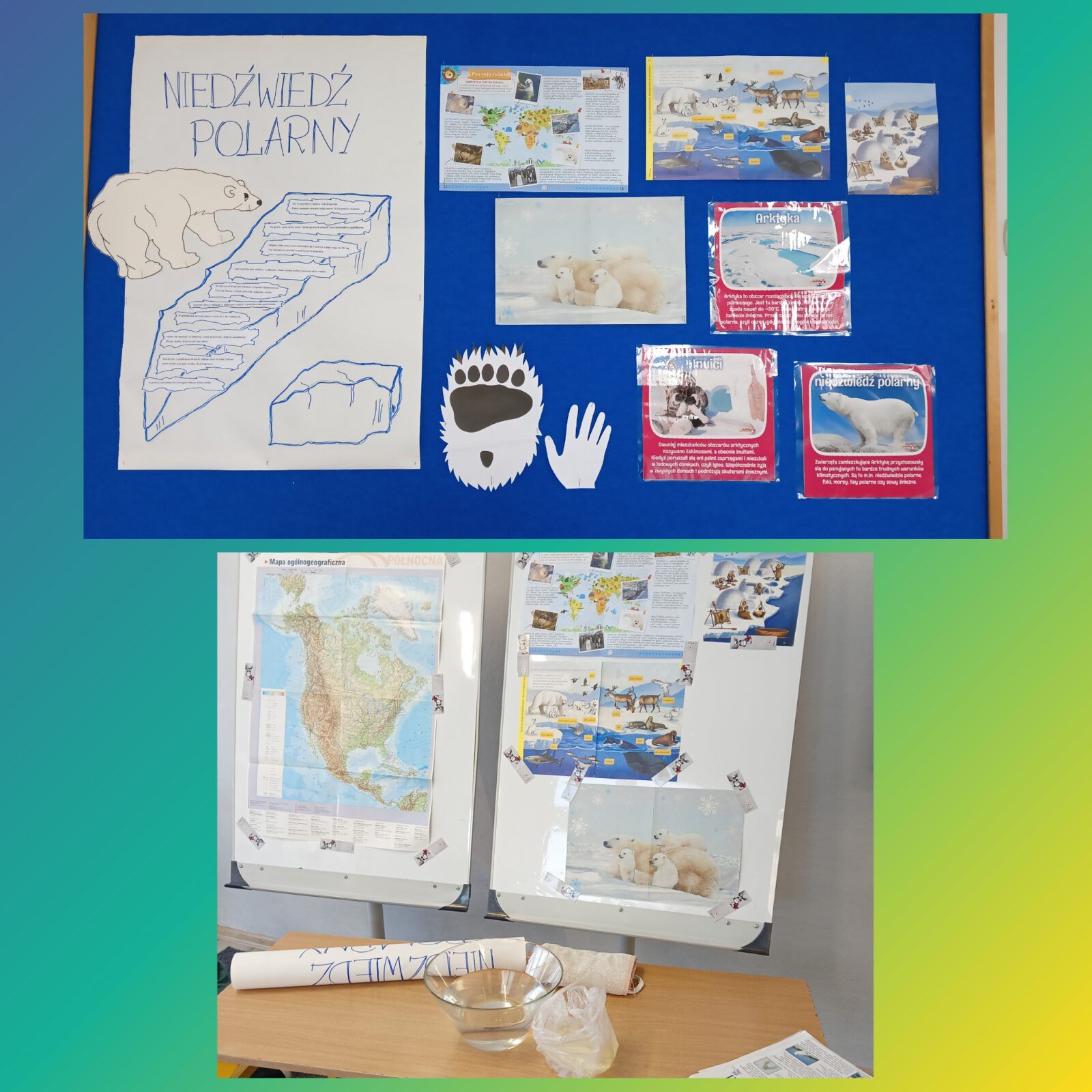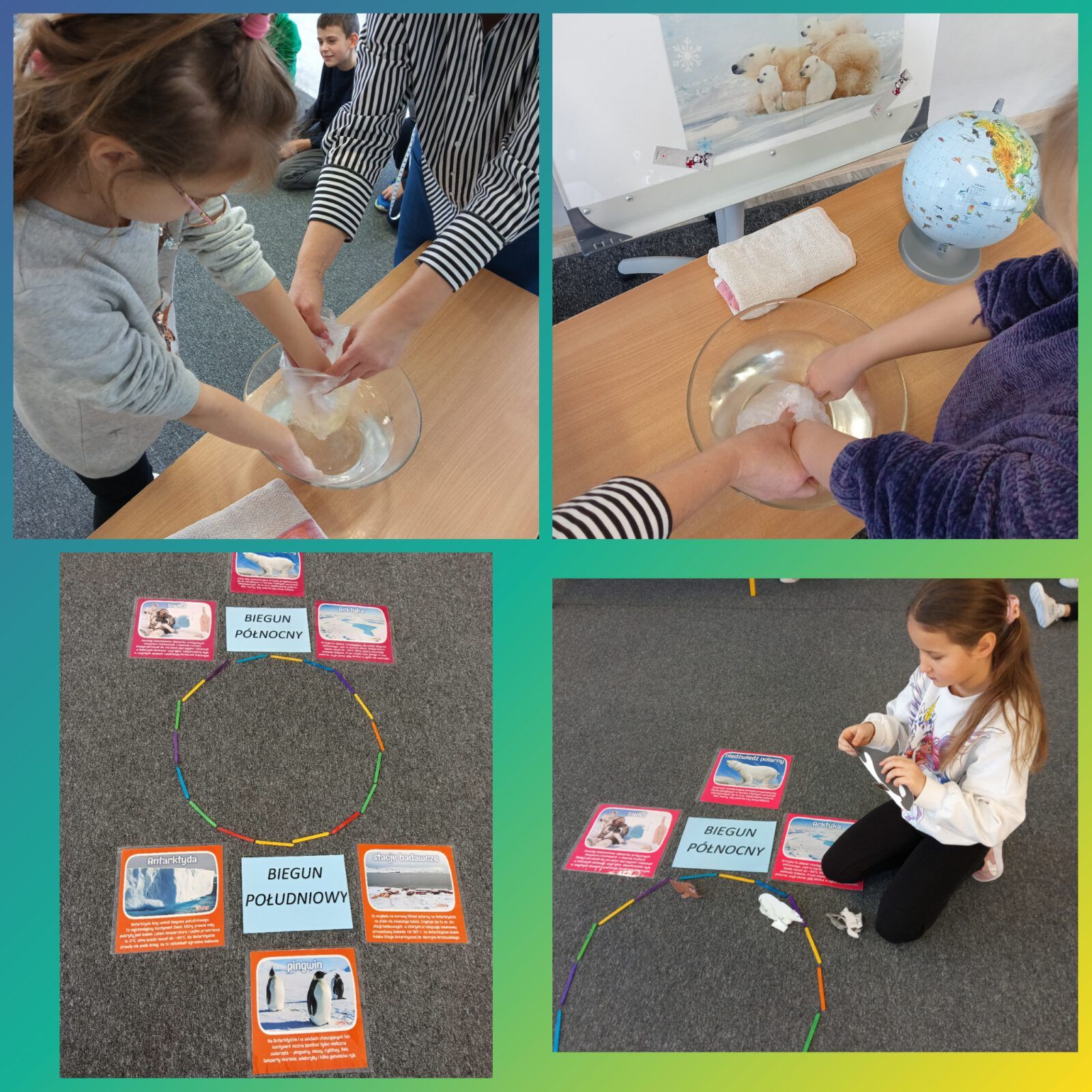 O tych i innych ciekawostkach dowiedziały się dzieci podczas zajęć w świetlicy szkolnej. Mierzyły długość i szerokość łapy niedźwiedzia polarnego, porównywały ją z wielkością własnych dłoni oraz dowiedziały się, dlaczego niedźwiedzie nie marzną uczestnicząc w doświadczeniu z „rękawicą tłuszczową”. Odszyfrowały również zakodowaną wiadomość wykazując się bardzo dobrą znajomością alfabetu. Obejrzały prezentację medialną oraz bezbłędnie odpowiadały na pytania quizu będącego podsumowaniem zajęć.