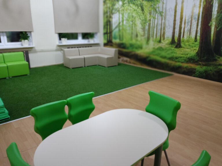 „Chill room” to przestrzeń, w której można wyciszyć się po intensywnych lekcjach, zrelaksować, zebrać myśli lub po prostu spędzić chwilę w przyjemnej, spokojnej atmosferze. To doskonała alternatywa dla zatłoczonych korytarzy i głośnych miejsc.
