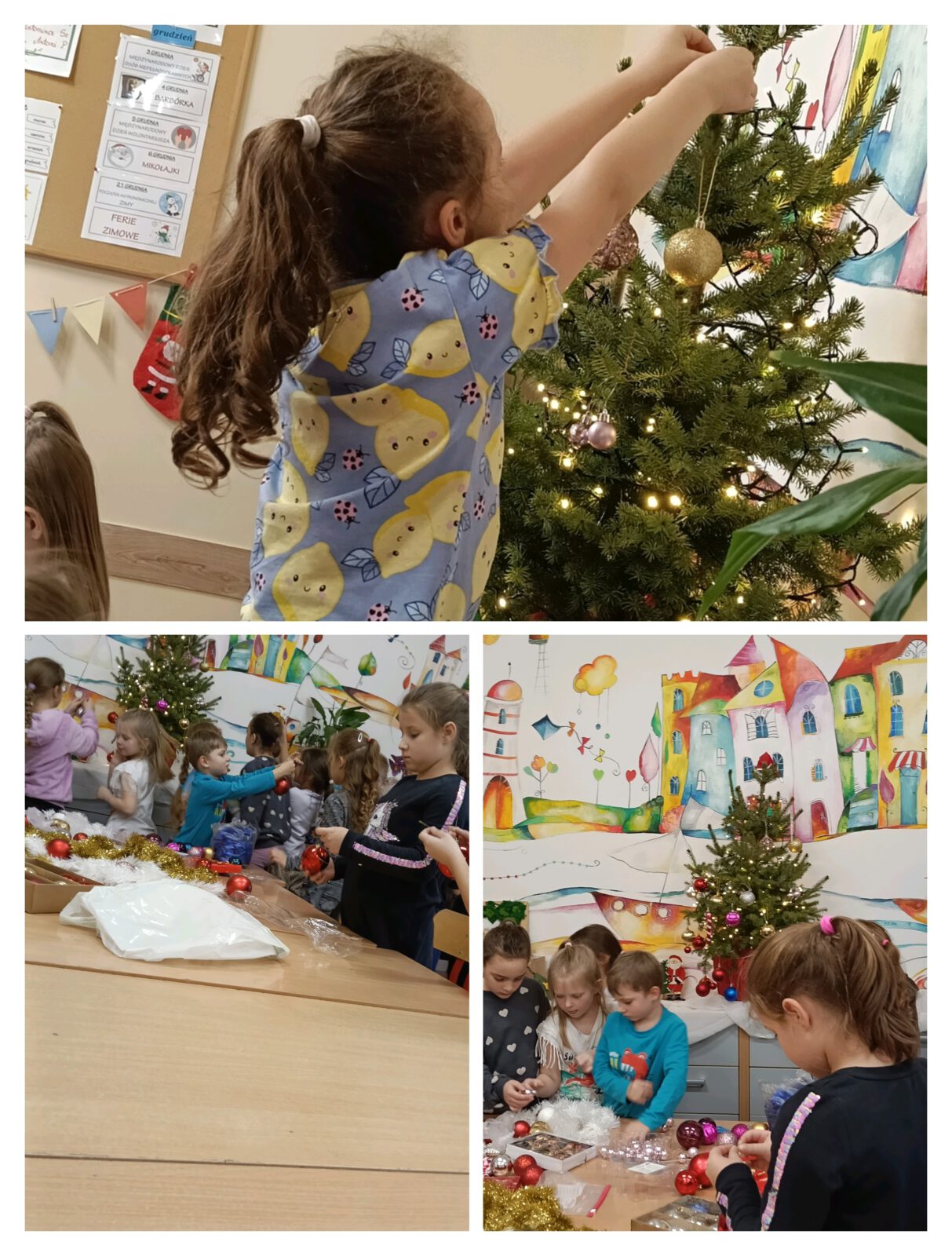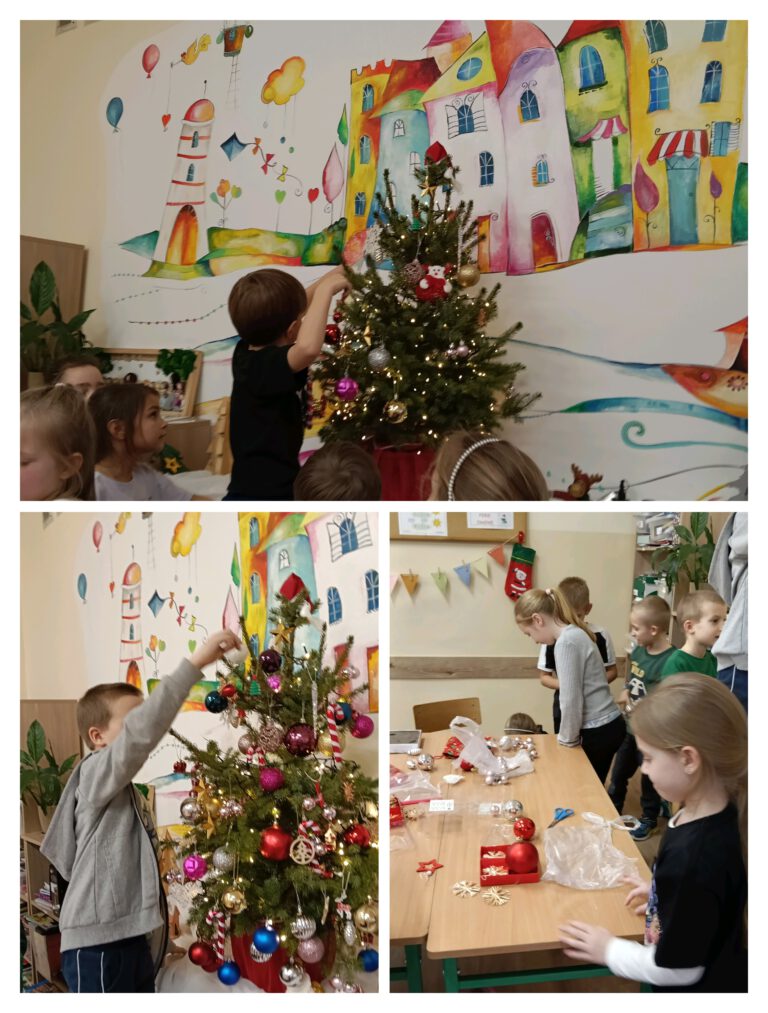 W naszej sali pojawiło się piękne, pachnące lasem drzewko. Z radością ozdabialiśmy je błyszczącymi bombkami. To nasza pierwsza wspólna choinka, po cichutku liczymy, że pewnego dnia znajdziemy pod nią drobne upominki 🙂