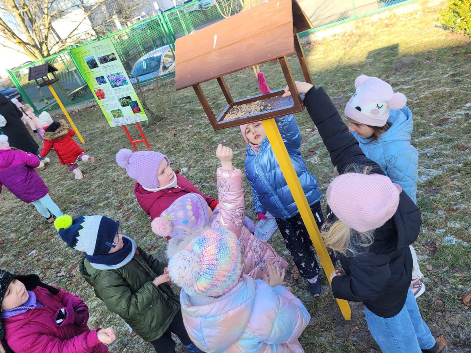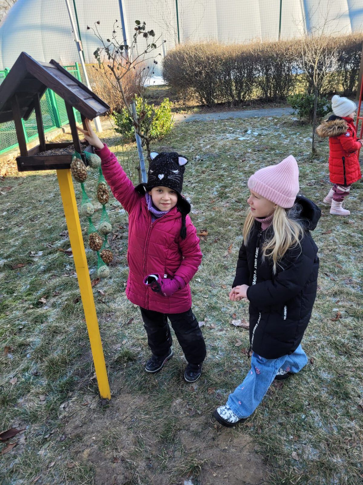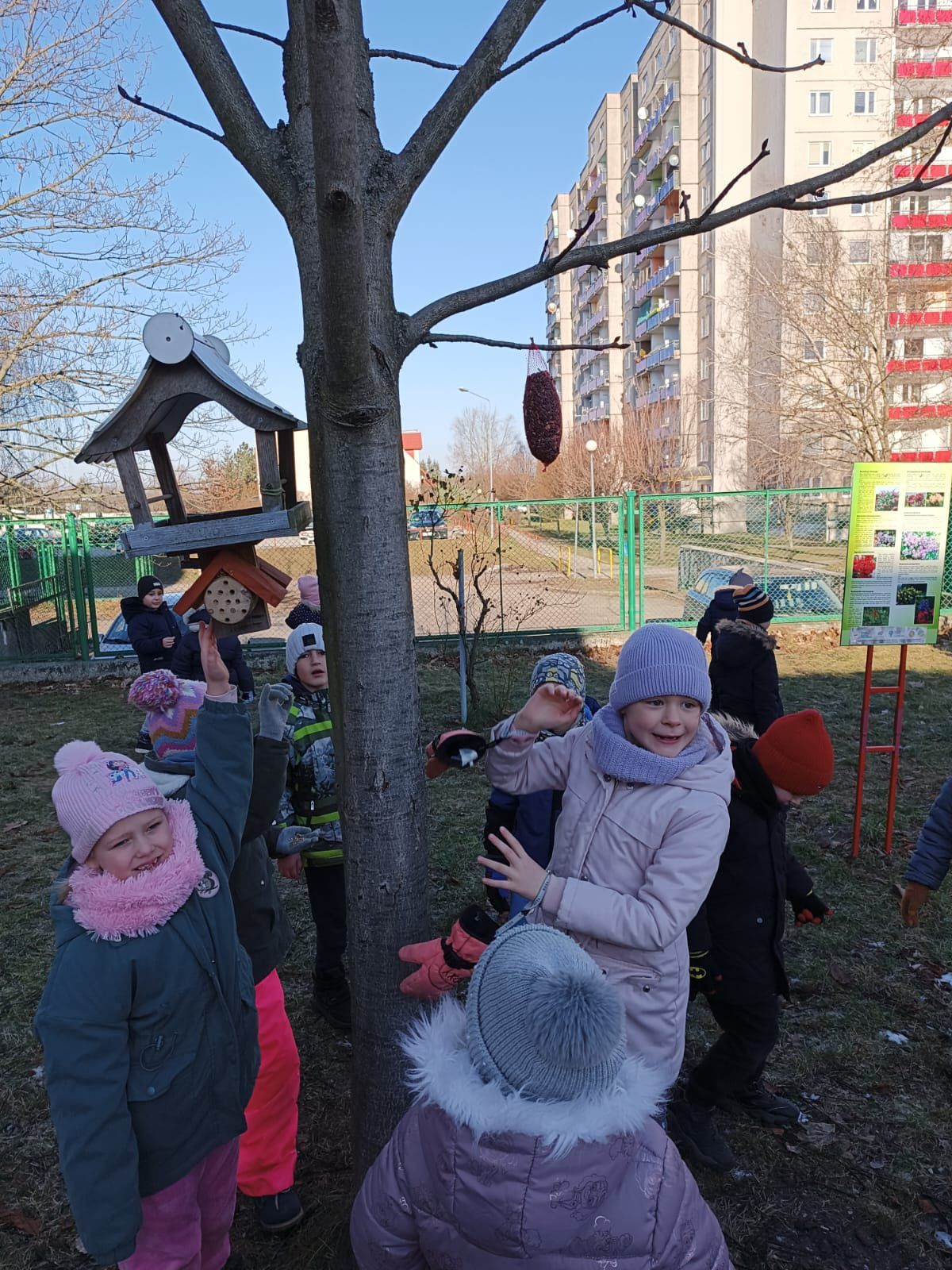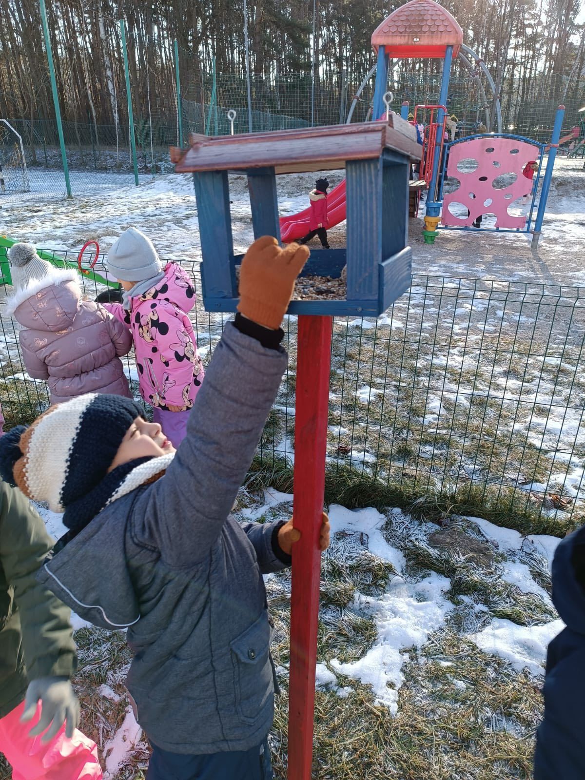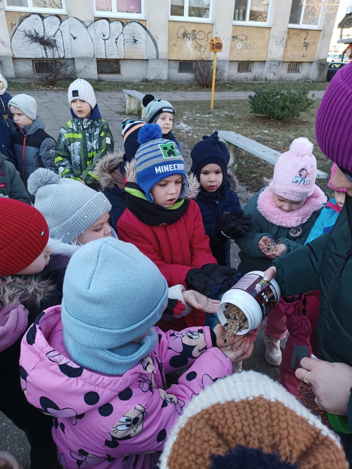 Podczas spacerów przedszkolaki dokarmiały ptaki, wsypując do karmników przygotowane ziarna. Rozmawialiśmy o tym, dlaczego zimą ptakom trudniej znaleźć pożywienie i w jaki sposób możemy im pomóc przetrwać mroźne dni. Dla dzieci była to nie tylko ciekawa przygoda, ale też ważna lekcja wrażliwości i troski o przyrodę. Z wielkim zaangażowaniem obserwowały ptaki przylatujące do karmnika i z radością sprawdzały, czy przygotowany pokarm znika.