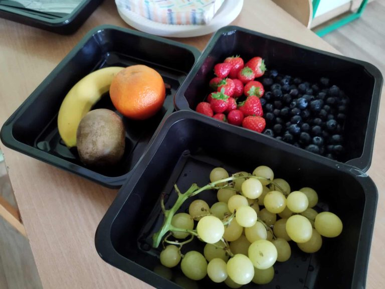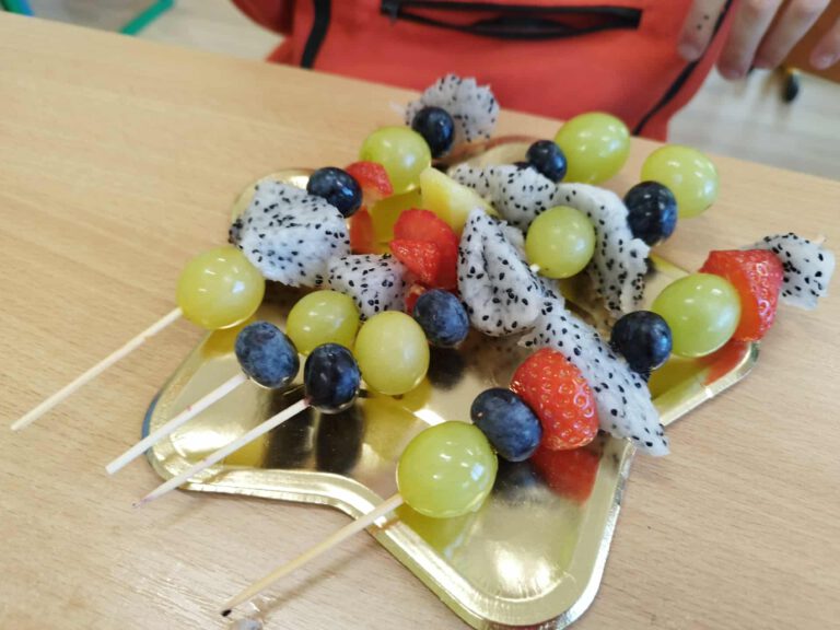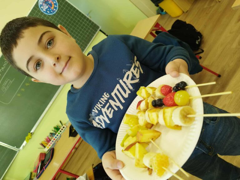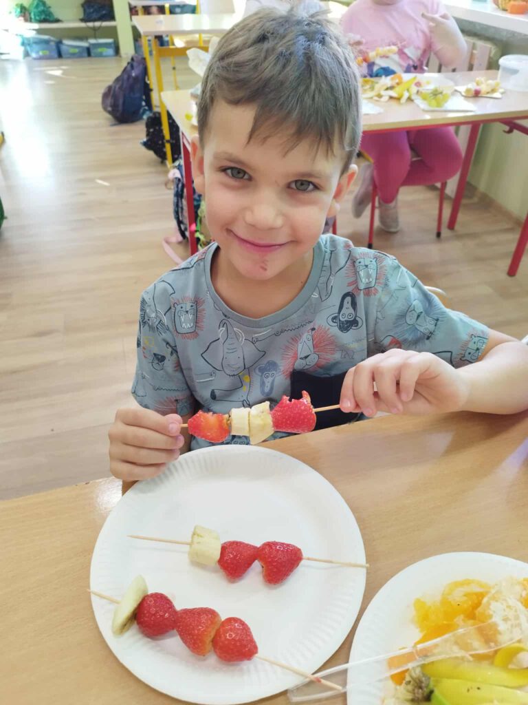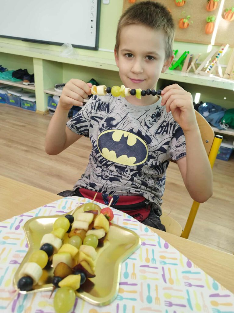 W piątek, 7 listopada 2025 roku, uczniowie klasy 2d obchodzili Dzień Zdrowego Jedzenia i Gotowania. Dzieci samodzielnie przygotowały pyszne, kolorowe owocowe szaszłyki, które ze smakiem zjadły. Podczas zajęć poznały również właściwości zdrowotne owoców oraz dowiedziały się, do jakich potraw można je wykorzystać. Było zdrowo, kolorowo i bardzo smacznie!