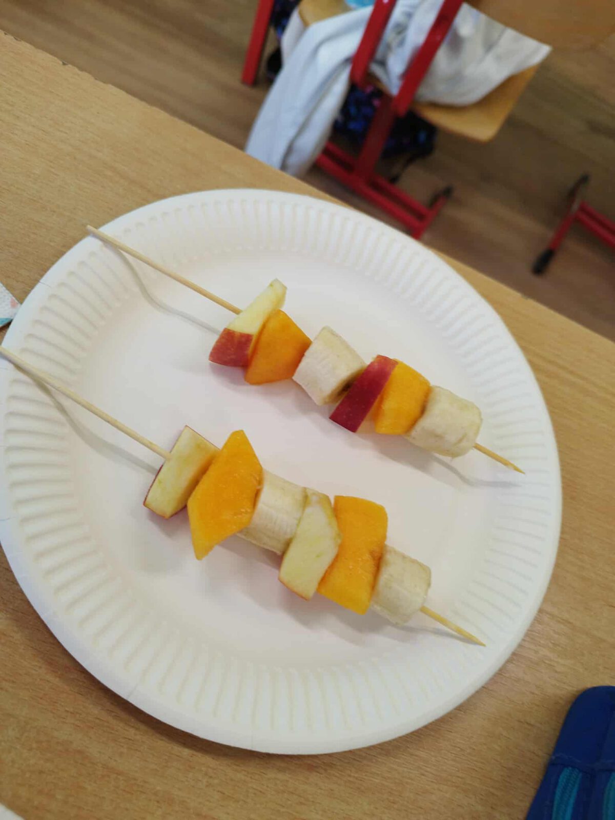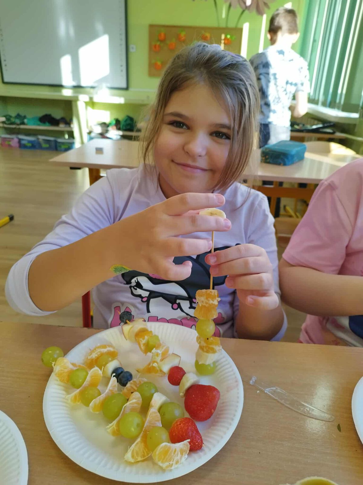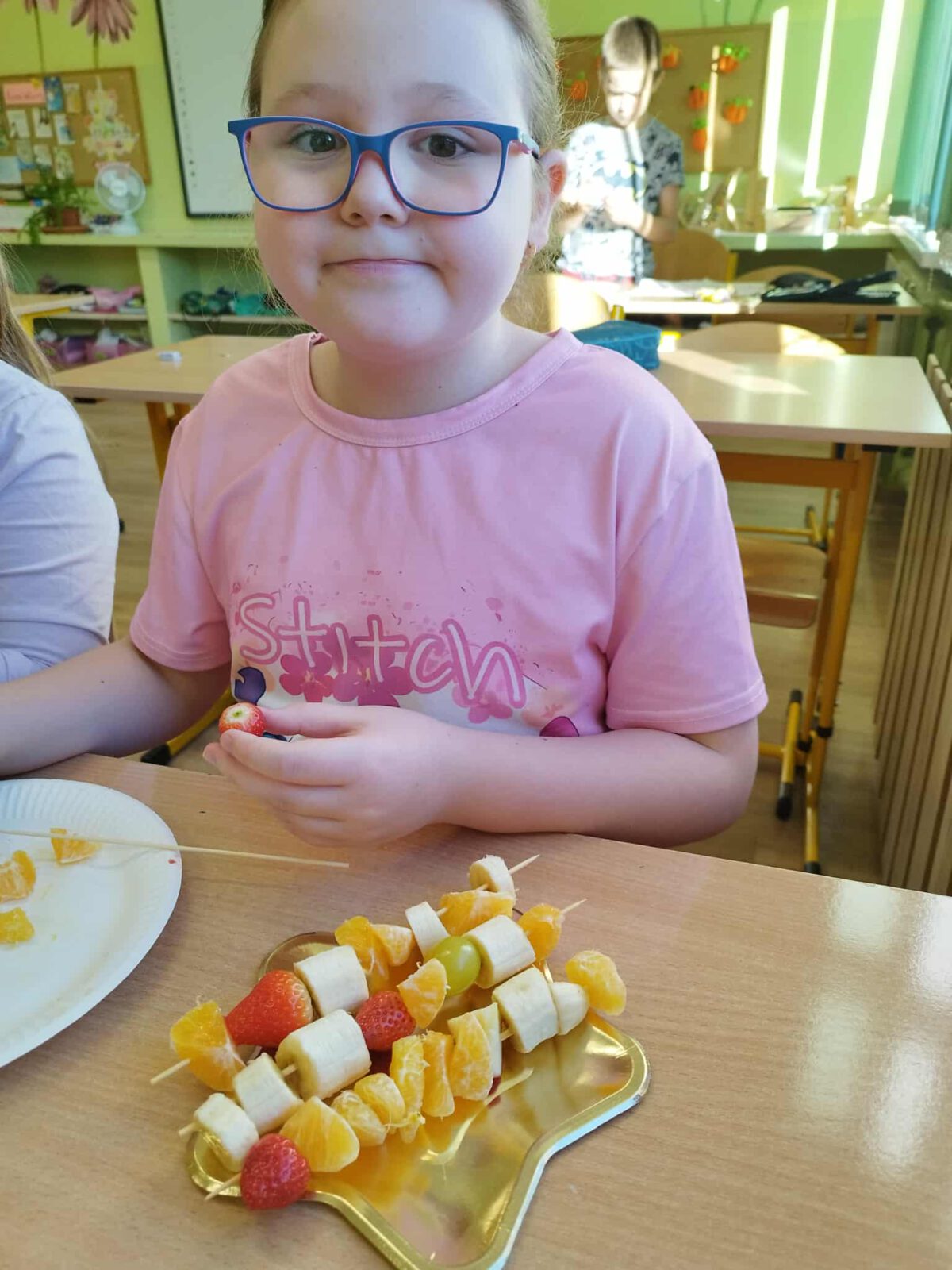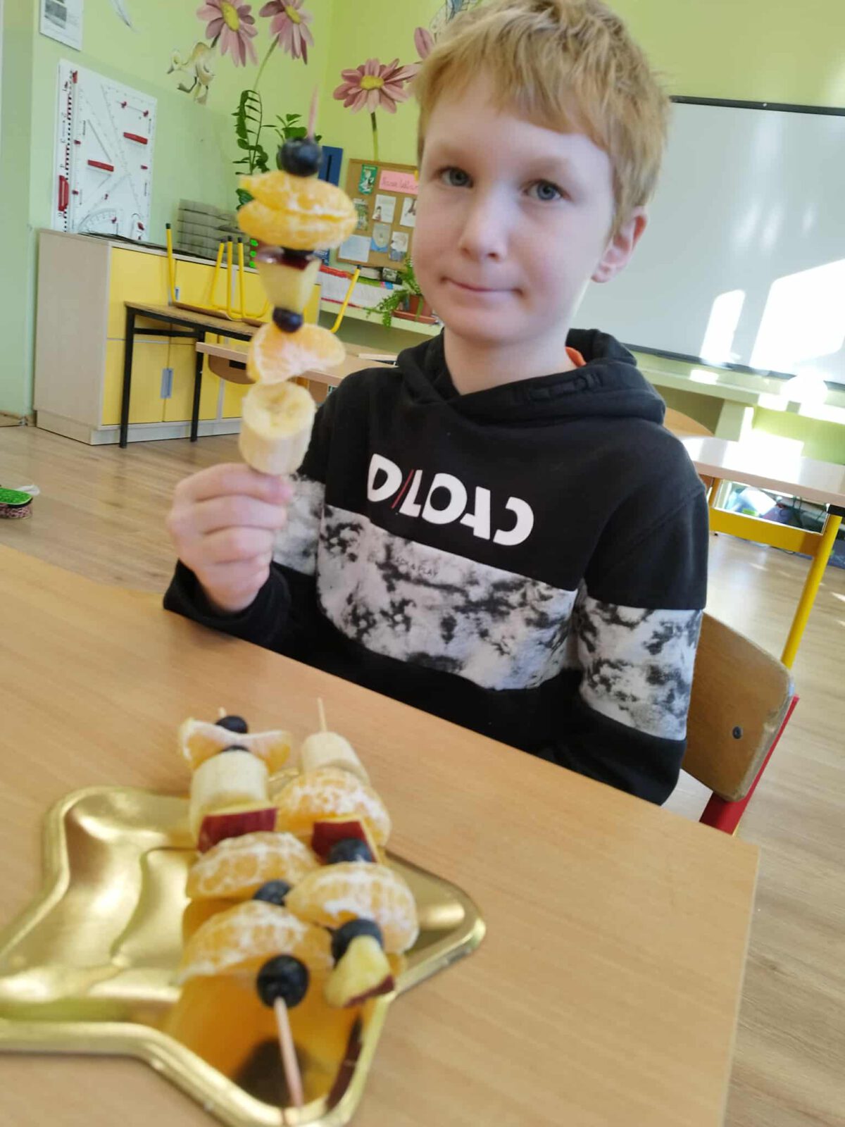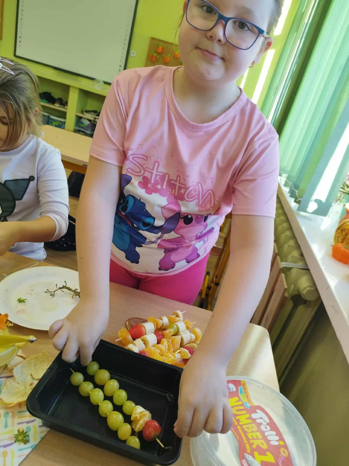 W piątek, 7 listopada 2025 roku, uczniowie klasy 2d obchodzili Dzień Zdrowego Jedzenia i Gotowania. Dzieci samodzielnie przygotowały pyszne, kolorowe owocowe szaszłyki, które ze smakiem zjadły. Podczas zajęć poznały również właściwości zdrowotne owoców oraz dowiedziały się, do jakich potraw można je wykorzystać. Było zdrowo, kolorowo i bardzo smacznie!