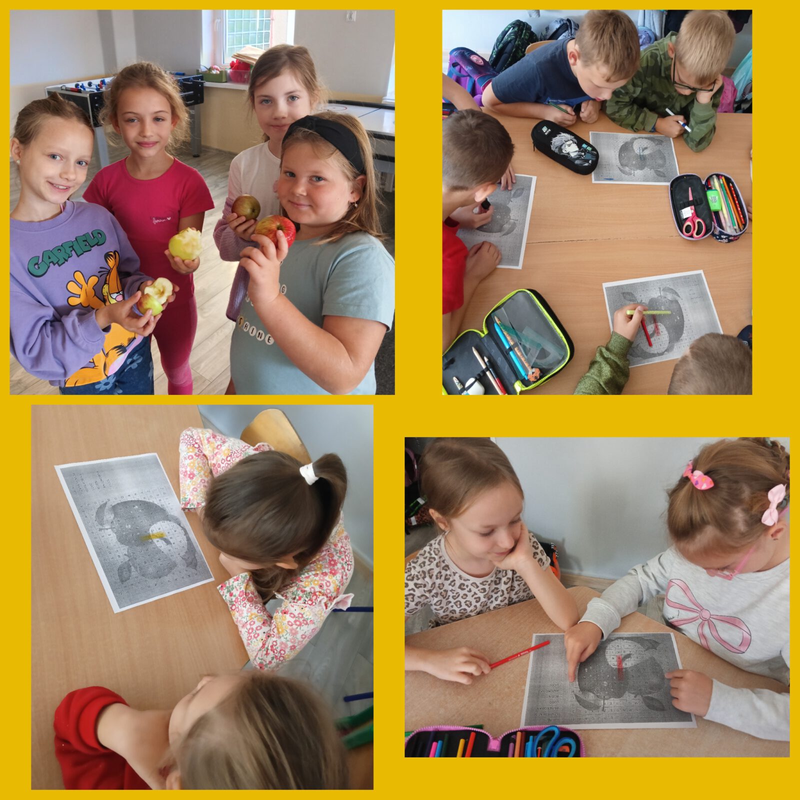 Podczas zajęć świetlicowych dzieci poznały zalety spożywania jabłek. Dowiedziały się ile kalorii zawiera jabłko, poznały różne gatunki jabłek – miały okazję je popróbować, a także wyliczały zastosowanie jabłka w kuchni.