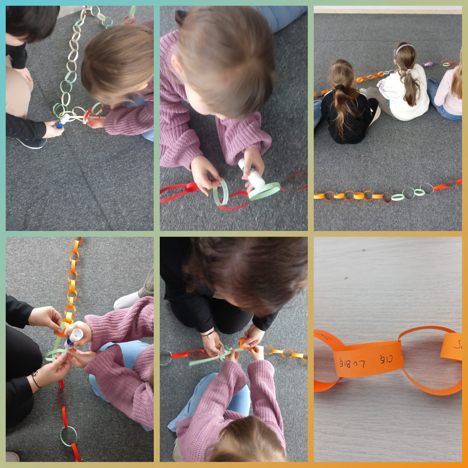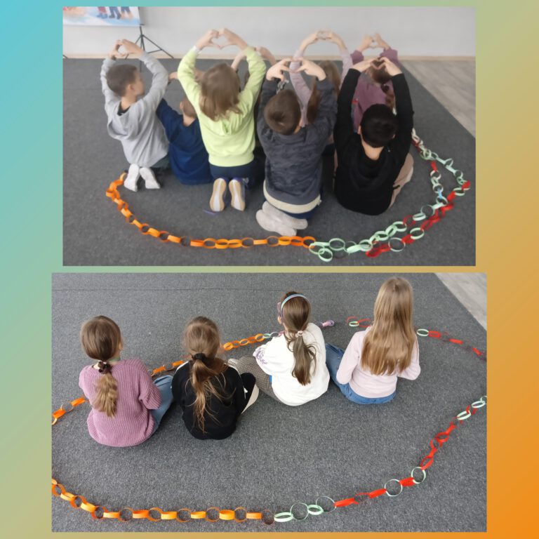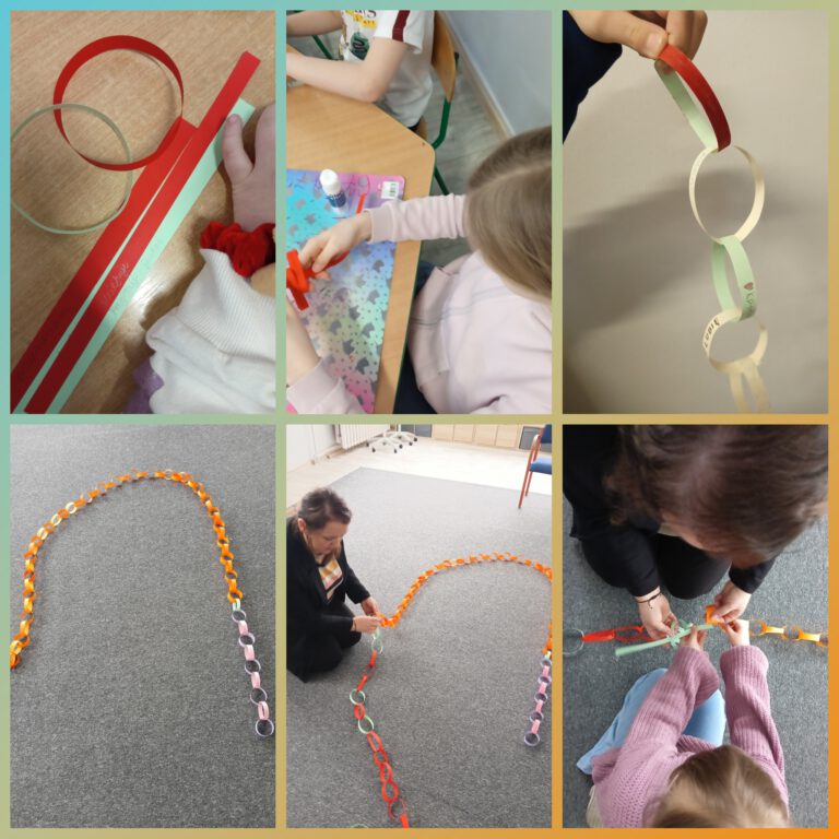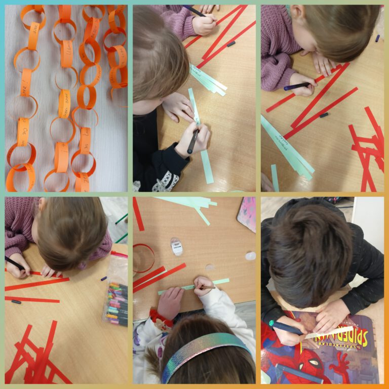 W piątek, w świetlicy – wspólnymi siłami, przygotowaliśmy Łańcuch miłych słów. Tę bardzo miłą akcję zorganizowała Pani Natalia Piskorz dla uczniów klas I-III. Nasz, dość długi łańcuch będzie częścią całego łańcucha, który przygotują uczniowie klas młodszych.