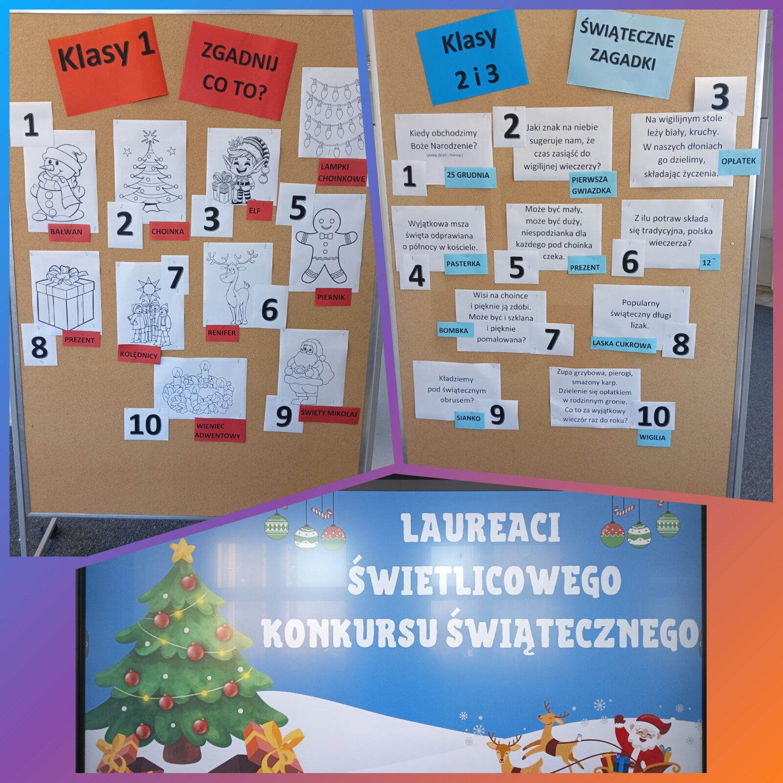 W kategorii klas I zadanie polegało na prawidłowym podpisaniu obrazków związanych z tradycjami świątecznym, natomiast w kategorii klas II i III – należało odgadnąć przygotowane zagadki, oczywiście związane ze świętami Bożego Narodzenia.