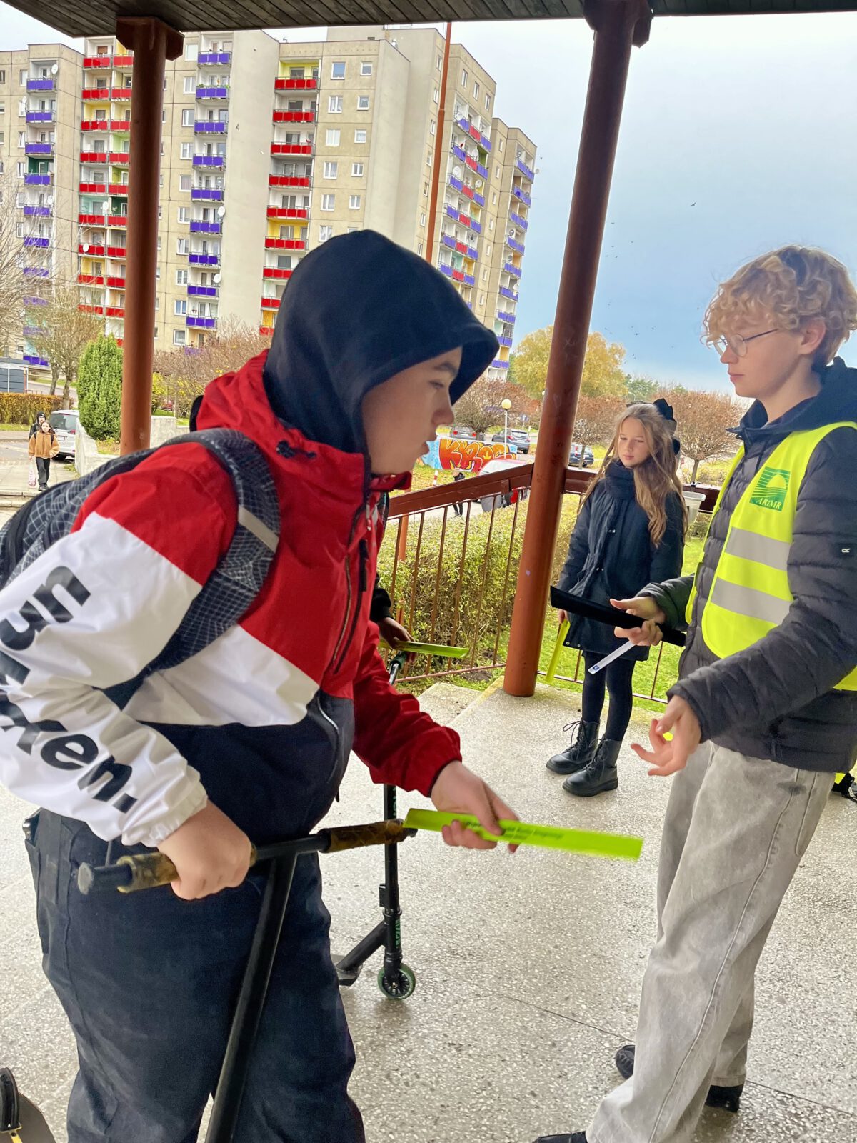 „Bądź widoczny w drodze do szkoły” 🚲🛴🦺⚠️- polegająca na wyposażaniu w odblaski pojazdów , na których uczniowie przyjeżdżają do szkoły – hulajnogi oraz rowery.