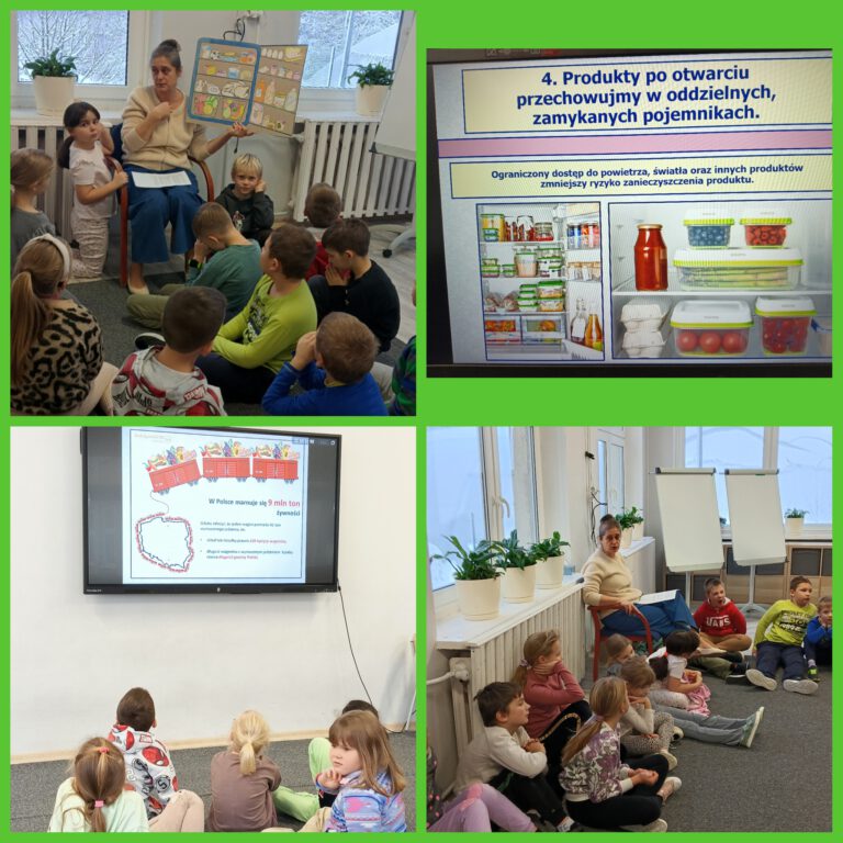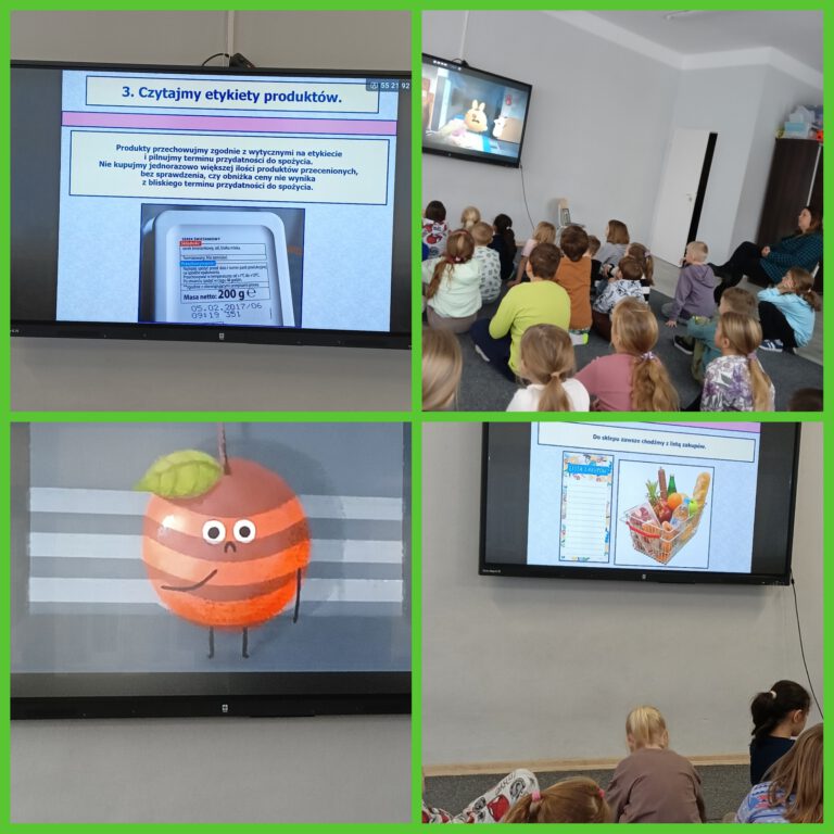 Na dzisiejszych zajęciach dzieci obejrzały film edukacyjny pt. „Zombie atakuje”, czyli zgniłe jabłko i marchewka, które zostały wrzucone przez Uchola do szkolnej szafki i zapomniane, a następnie obejrzały prezentację dotyczącą marnowania żywności. Dowiedziały się, że największymi marnotrawcami żywności okazują się być konsumenci, którzy odpowiadają za około 60% całego zmarnowanego jedzenia w Polsce. Najczęściej do kosza wyrzucamy pieczywo, owoce i warzywa…
