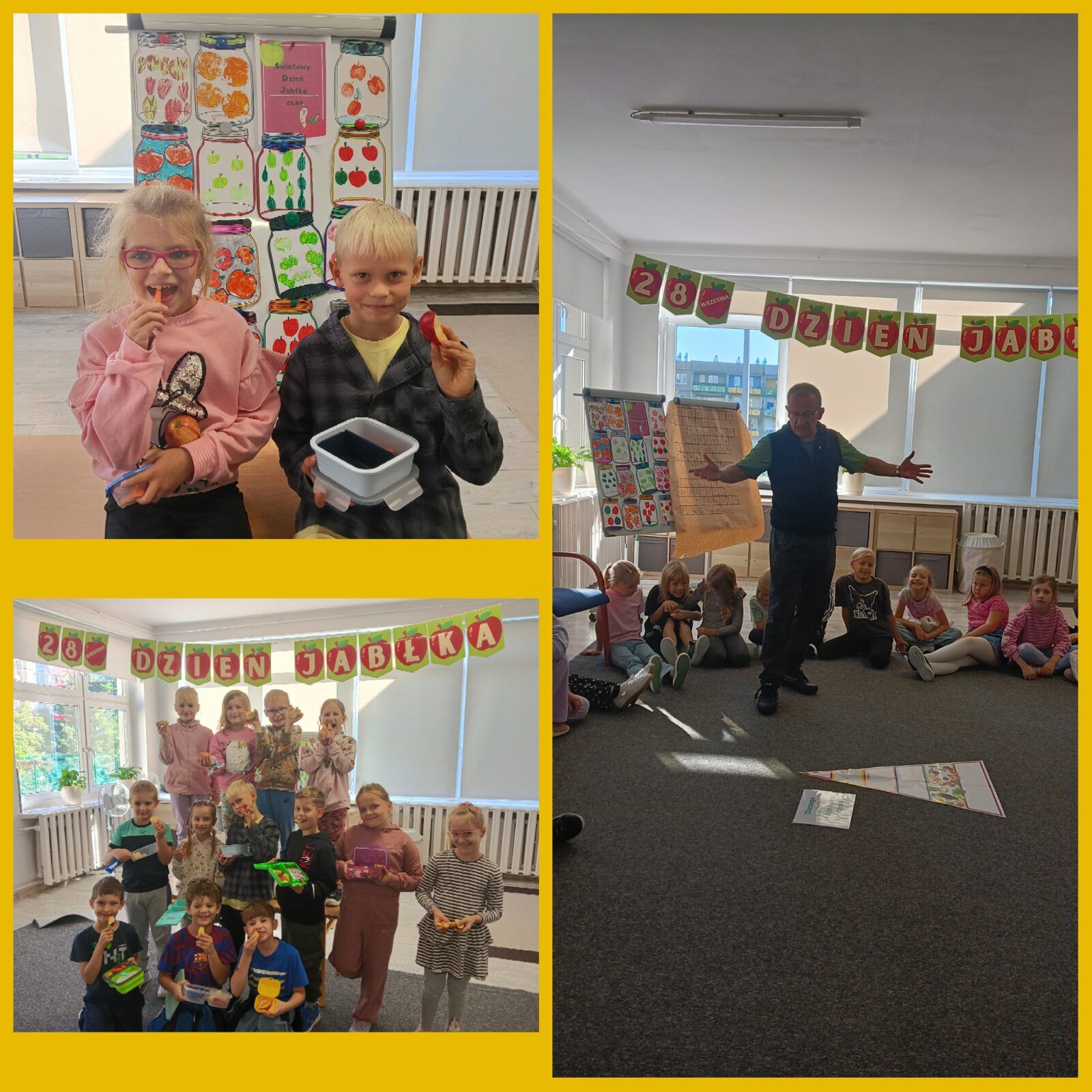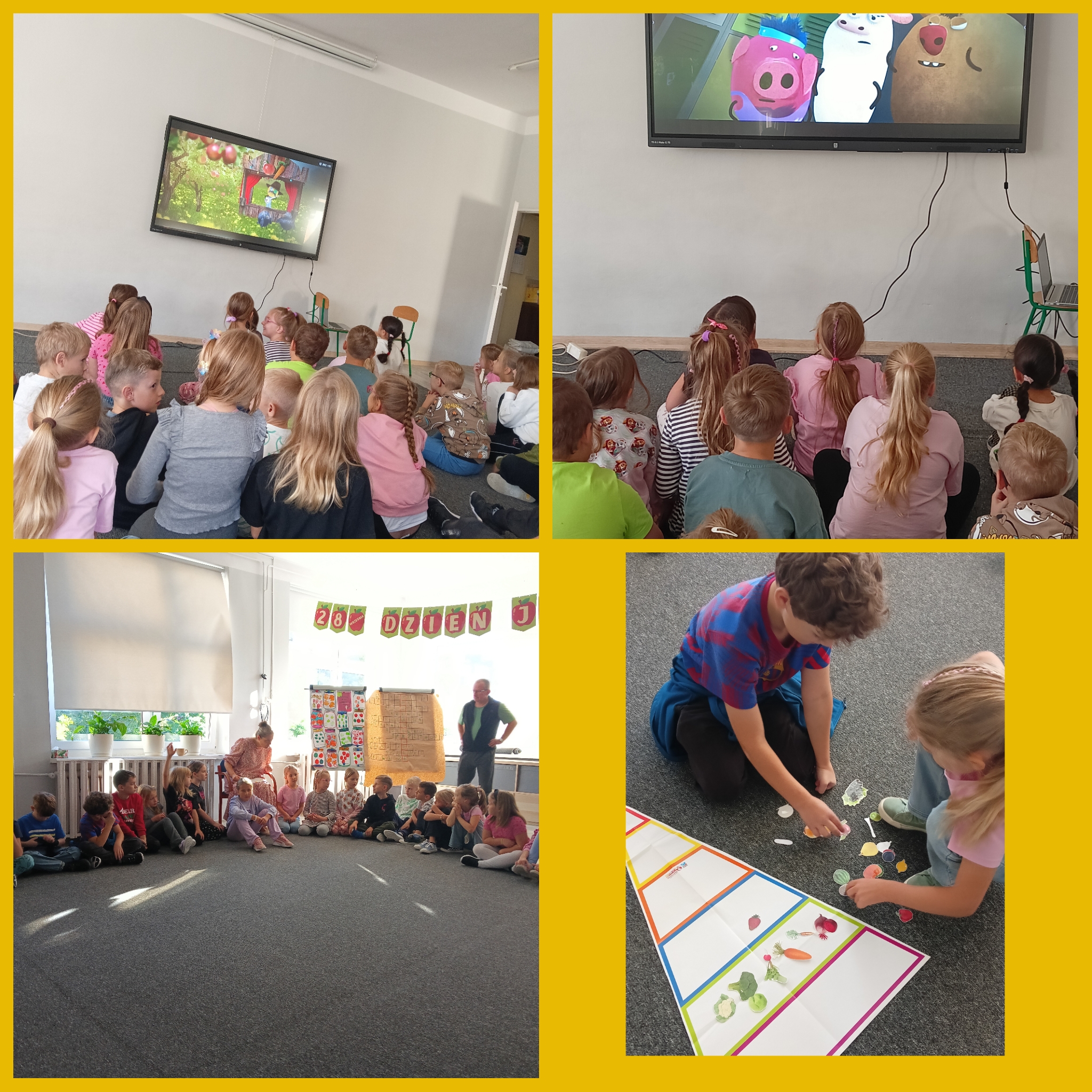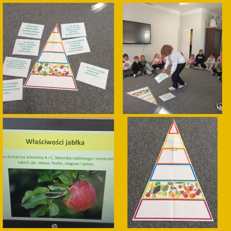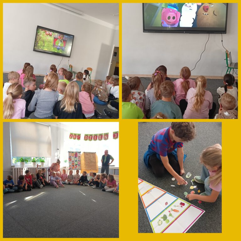 „Zombie”, czyli zgniłe jabłko i marchewka, które zostały wrzucone przez Uchola do szkolnej szafki i zapomniane… Na dzisiejszych zajęciach w świetlicy szkolnej dzieci dowiedziały się co to jest kompost oraz dlaczego warto jeść świeże owoce i warzywa. Ułożyły też owoce i warzywa na właściwym piętrze piramidy zdrowia. Obejrzały prezentację medialną o gatunkach jabłek. Dowiedziały się, że na świecie istnieje ponad 8 tysięcy odmian jabłek, a w Polsce najpopularniejsze to Ligol, Szampion, Jonagold, Golden Delicious, Gala, Idared, Lobo i Gloster.