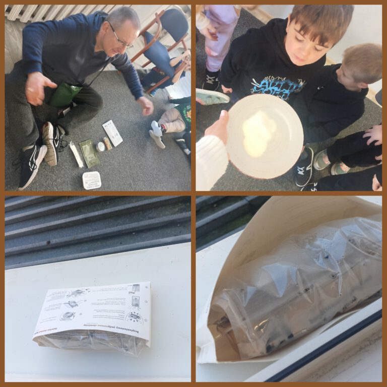 Produkty liofilizowane znalazły się również w dziennej racji żywnościowej żołnierza, którą pokazał dzieciom pan Hubert.