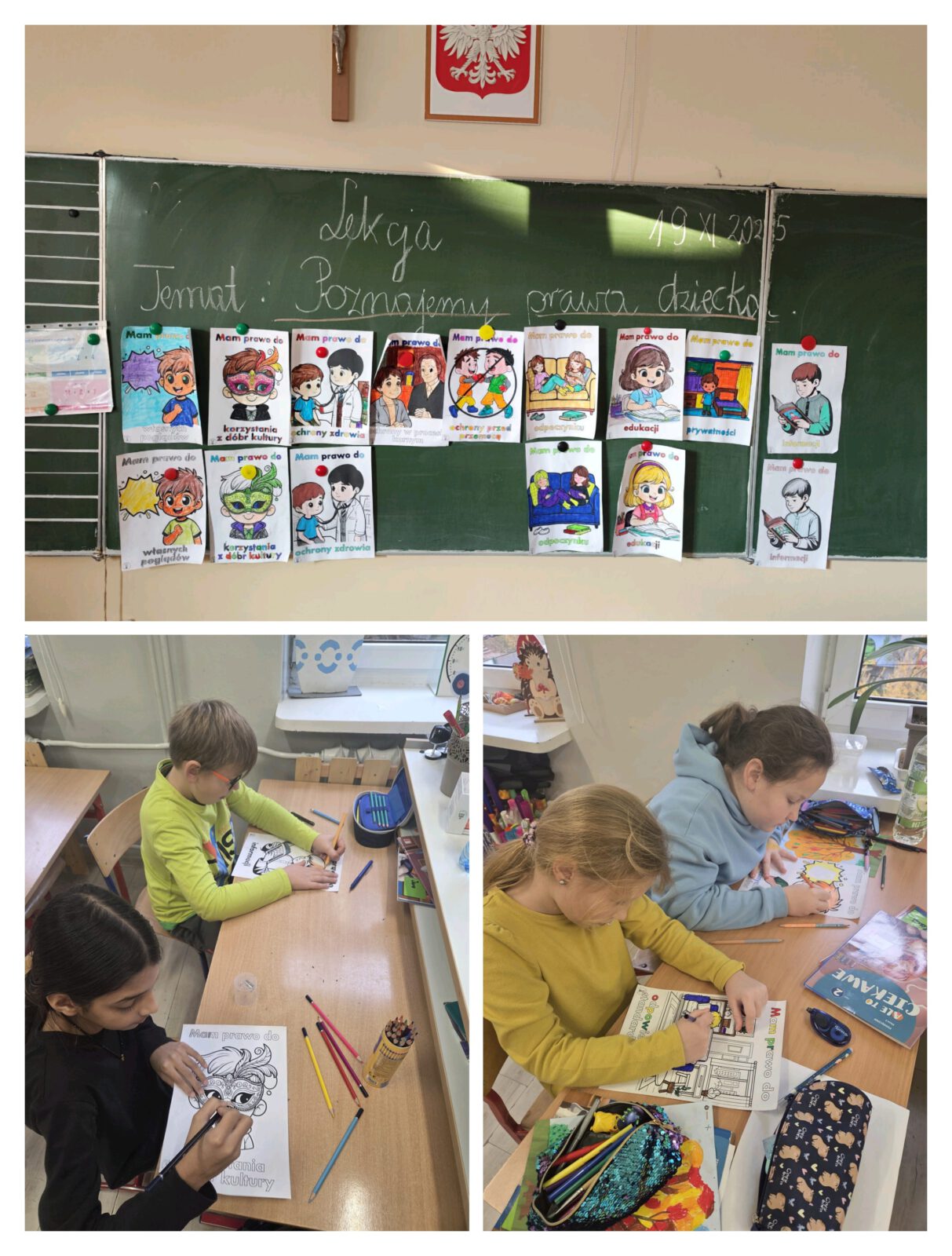 21 listopada uczniowie klasy 3B również uczcili to święto. Trzecioklasiści poznali historię jego powstania oraz znaczenie obchodów. Obejrzeli film edukacyjny przedstawiający prawa i obowiązki dzieci, a następnie każdy z nich otrzymał kartę z wybranym prawem dziecka do pokolorowania. Po wykonaniu pracy wspólnie omawiali znaczenie poszczególnych praw.