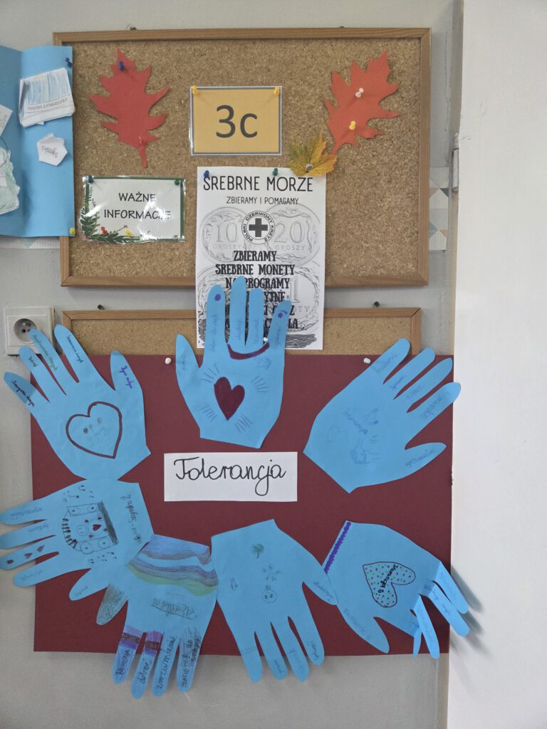 W klasie 3C uczniowie rozpoczęli Dzień Tolerancji od quizu sprawdzającego ich wiedzę. Późniejsza rozmowa pozwoliła dzieciom podzielić się własnymi przemyśleniami na temat akceptacji i otwartości. Na papierowych dłoniach zapisały, co dla nich oznacza tolerancja.