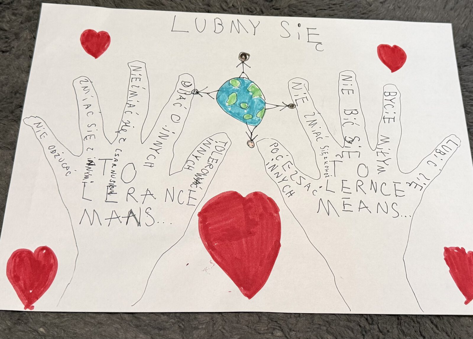 Na lekcji języka angielskiego uczniowie klasy 2A rozmawiali o sposobach okazywania tolerancji na co dzień. Poznali nowe słownictwo związane z tematem oraz obejrzeli krótki film wprowadzający. Następnie odrysowali swoje dłonie i wpisali w nie indywidualne definicje tolerancji. W efekcie powstały różnorodne, pełne ciepła prace, które pokazały, jak można być dobrym i życzliwym dla innych.