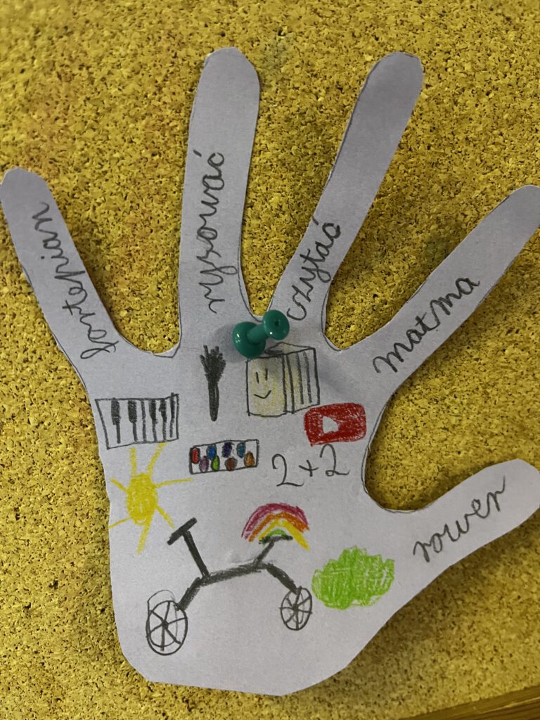 Uczniowie klasy 3B podczas wspólnych warsztatów starali się odpowiedzieć na pytania: czym jest tolerancja, dlaczego jest tak ważna oraz co wnosi do naszego życia różnorodność. Rozmawiali o szacunku i akceptacji, a także o tym, że każdy człowiek może mieć swoje odmienne pasje, upodobania i marzenia. Dzieci opowiadały, kim chciałyby zostać w przyszłości oraz co lubią robić, zauważając, że dzięki temu nawzajem się uzupełniają. Obejrzały film edukacyjny o różnorodności, stworzyły mapę myśli dotyczącą tolerancji oraz zastanawiały się, jakie cechy ma osoba tolerancyjna. Na koniec każdy odbił swoją dłoń i uzupełnił ją informacjami o swoich zainteresowaniach.