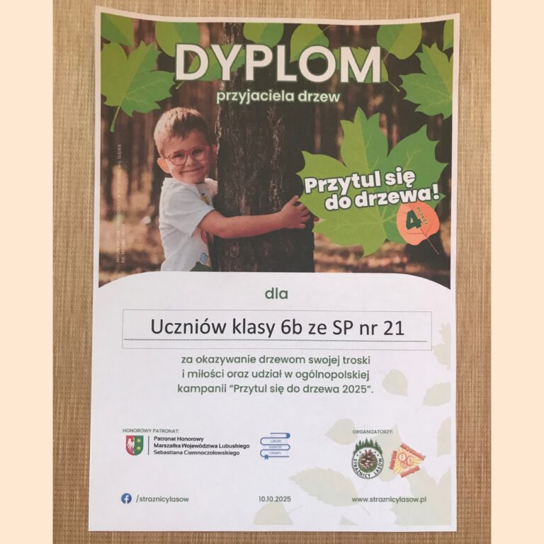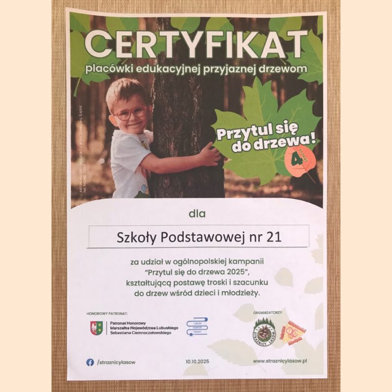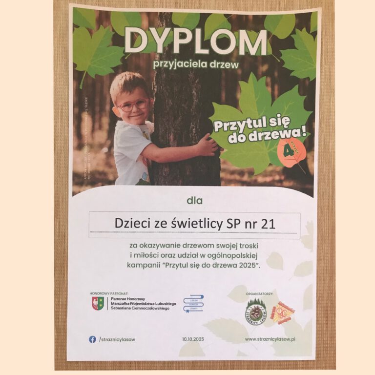 Dzieci uczęszczające do świetlicy szkolnej oraz uczniowie klasy 6b wzięli udział w IV edycji kampanii „Przytul się do drzewa” 2025, która ma na celu promowanie ochrony lasów i zachęcanie do bliskości z naturą poprzez przytulanie drzew.