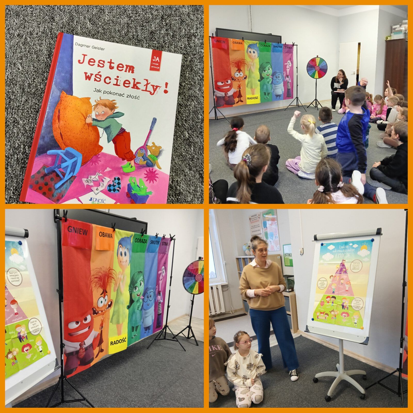 Dowiedziały się, jak pokonać złość na podstawie książki z serii JA i moje emocje Dagmary Geislery „Jestem wściekły”. Kolorowały tematyczne malowanki oraz obejrzały fragmentami bajki „W głowie się nie mieści”.