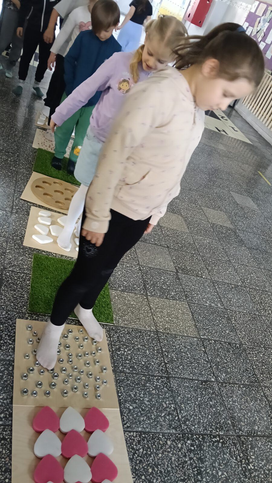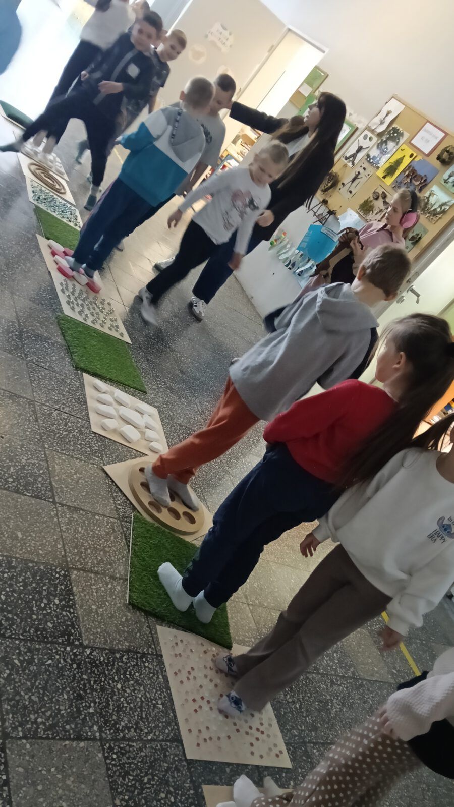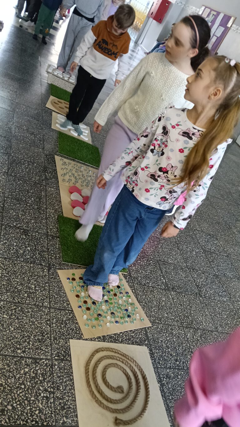 Uczniowie klasy 1b wyostrzyli zmysł dotyku podczas przygotowanej przez panią Anię ścieżki sensorycznej. Ta sama droga, a tyle różnych odczuć: łaskotki, mrowienie, drapanie, kłucie i przyjemne masowanko. Dziękujemy za tak bogate doświadczenie Pani Aniu.
